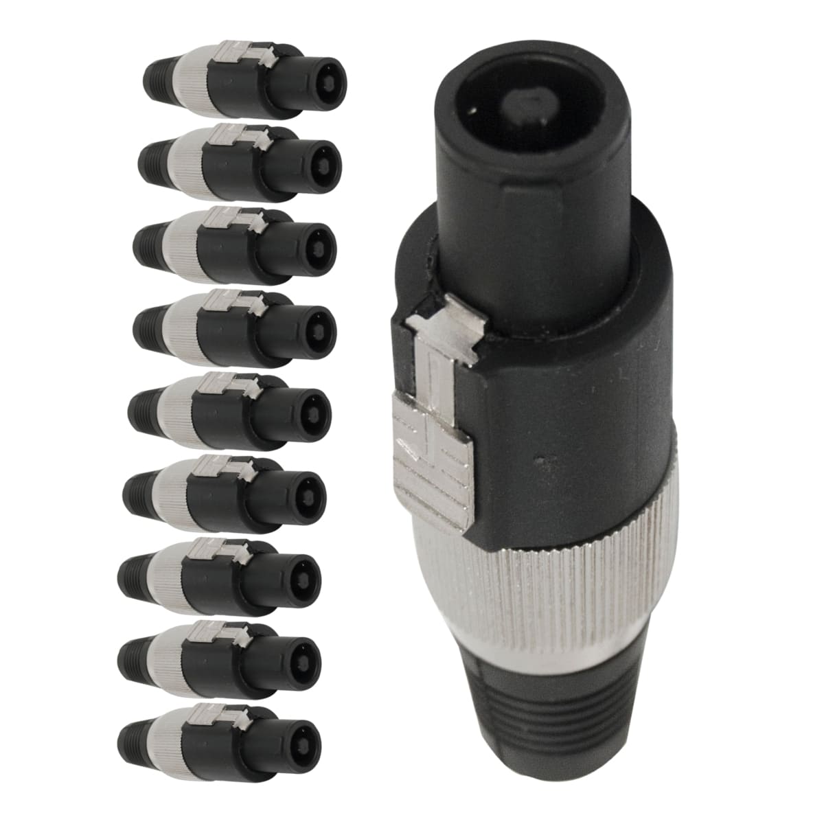 O Plug Speak-On 4 Polos Storm em metal oferece conexão segura, firme e durável para sistemas de áudio profissionais, garantindo transmissão eficiente de sinais de alto-falante com mínima perda.