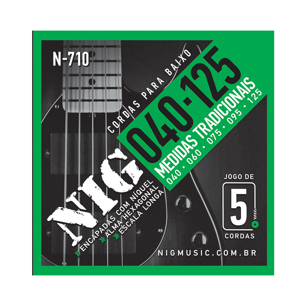 Encordoamento para Baixo 5 Cordas 040-125 NIG Medidas Tradicionais N710: Medidas: 040/125 contrabaixo encapadas com níquel alma hexagonal escala longa Calibres:.040