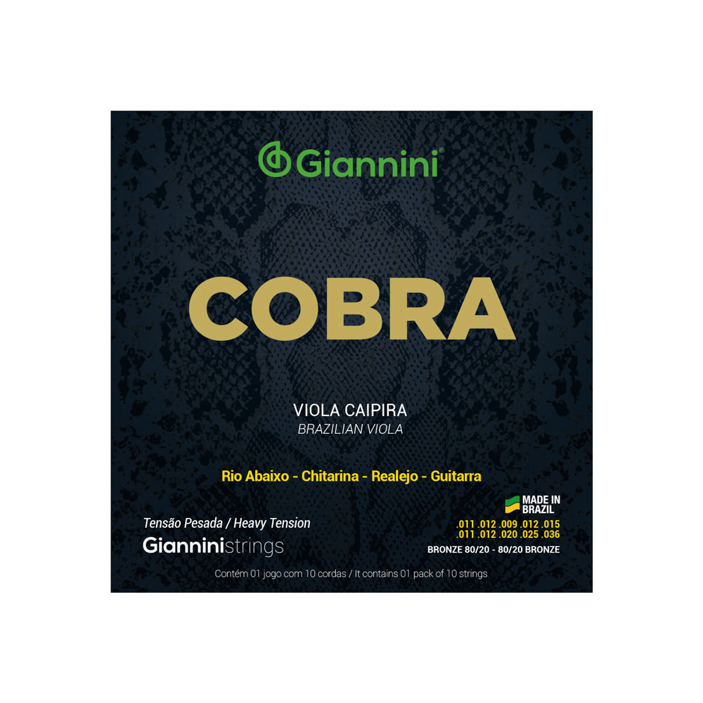 A Série Cobra possui diferentes modelos de jogos de cordas para Viola Caipira. São várias tensões e materiais como Cobre Prateado e Níquel, atendendo aos requisitos dos mais conhecidos padrões de afinação, acertando em cheio no gosto dos músicos mais exigentes. - Encordoamento para Viola Caipira Acústica Pesada (Rio Abaixo) com Laço e Revestimento Bronze 80/20 Giannini Cobra CV82H. Calibres:.010