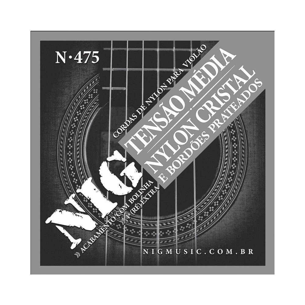 Encordoamento para Violão Nylon Tensão Média Cristal/Prata, com bolinha e corda extra, NIG Nylon Cristal N475: Medidas: 028/043 tensão média acabamento com bolinha 4 (ré) extra contém 06 cordas Calibres:N/A