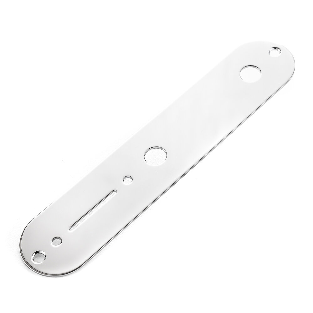 Escudo para placa de controle para guitarras modelo Telecaster, em metal com acabamento cromado.