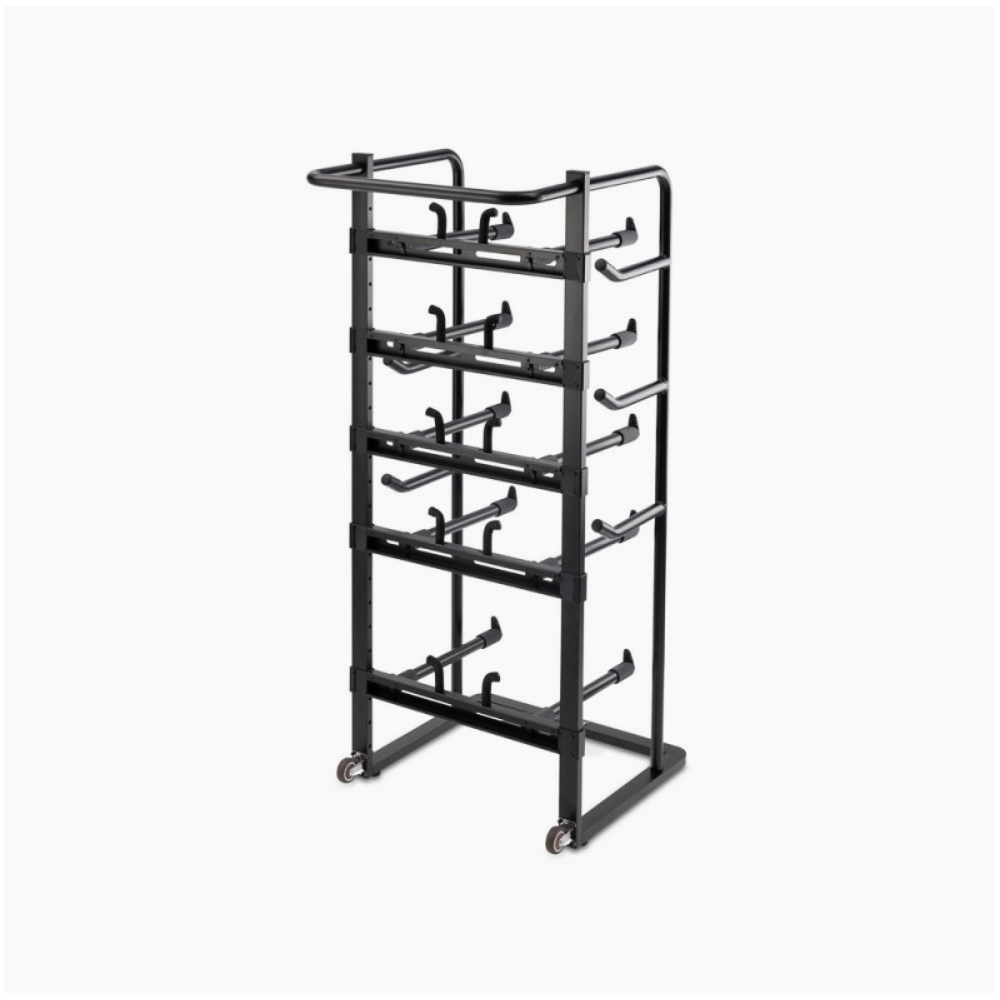 Armazena até cinco caixas de bateria de até 16" de diâmetro cada. Permite diferentes configurações para acomodar uma coleção de caixas. A acomodação vertical dos tambores garante que eles permaneçam silenciosos quando não estiverem em uso e estiverem com seus automáticos desligados. Braços de suporte revestidos em borracha e barras transversais são removíveis para uma aparência limpa, independentemente da quantidade de caixas em exposição. Possui rodinhas para fácil mobilidade. COR:Preto