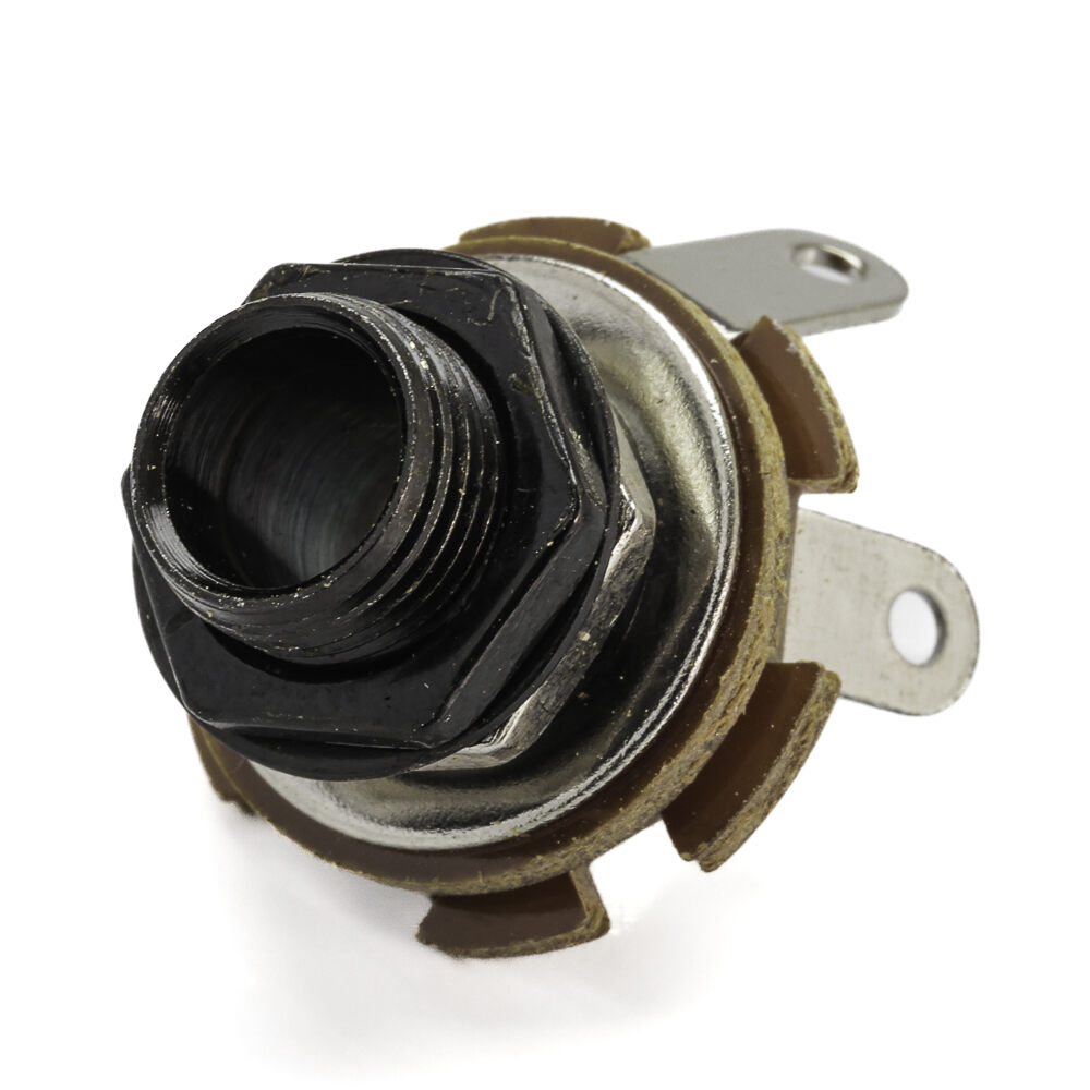 Jack de Conexão Mono Preto, 6 unidades, Spirit Guitar Parts - MJ2-BK. - Jack curto de saída mono com rosca MP.0-0.75 - Aceita plug padrão 1/4, ideal para a maioria dos instrumentos de cordas elétricos - Acompanha uma arruela e duas porcas. Instrumentos compatíveis:Guitarra/Baixo