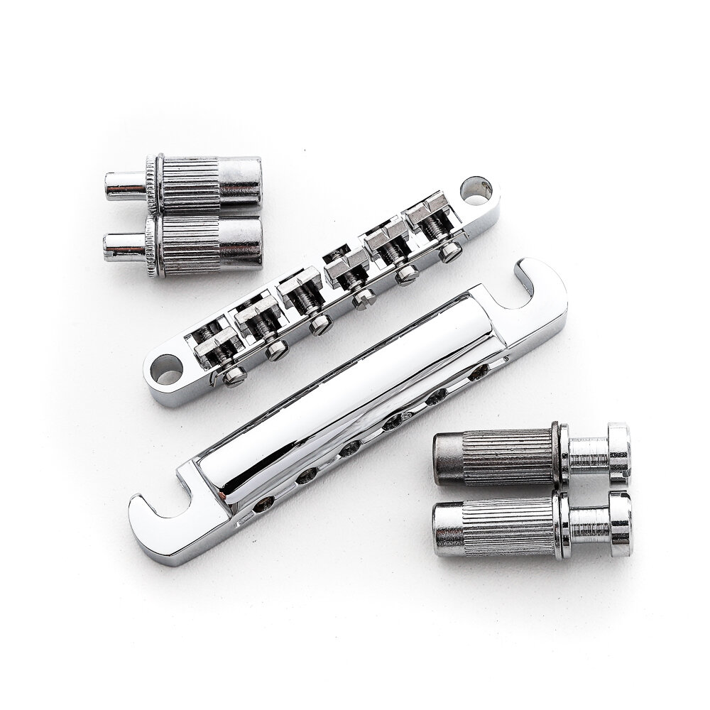 Ponte para Guitarra modelo Les Paul, em acabamento Cromado, Spirit Guitar Parts - LP17BRD-CR/LTZC-CR. Em 1954, a Gibson alterou pela terceira vez o design das suas guitarras criando assim a clássica ponte Tune-o-matic. Essa nova ponte possui entonação individual para as cordas mas o ajuste de altura da ponte é geral. O estilo antigo dessas pontes possui dois pinos em formato de roda para ajuste da altura, mas as guitarras modernas possuem um design de ponte Tune-o-matic que se encaixa melhor e possuem os pinos com cabeça no formato para uso de chave fenda. A direção e os tipos de saddles podem ser mudados de acordo com as necessidades do consumidor.