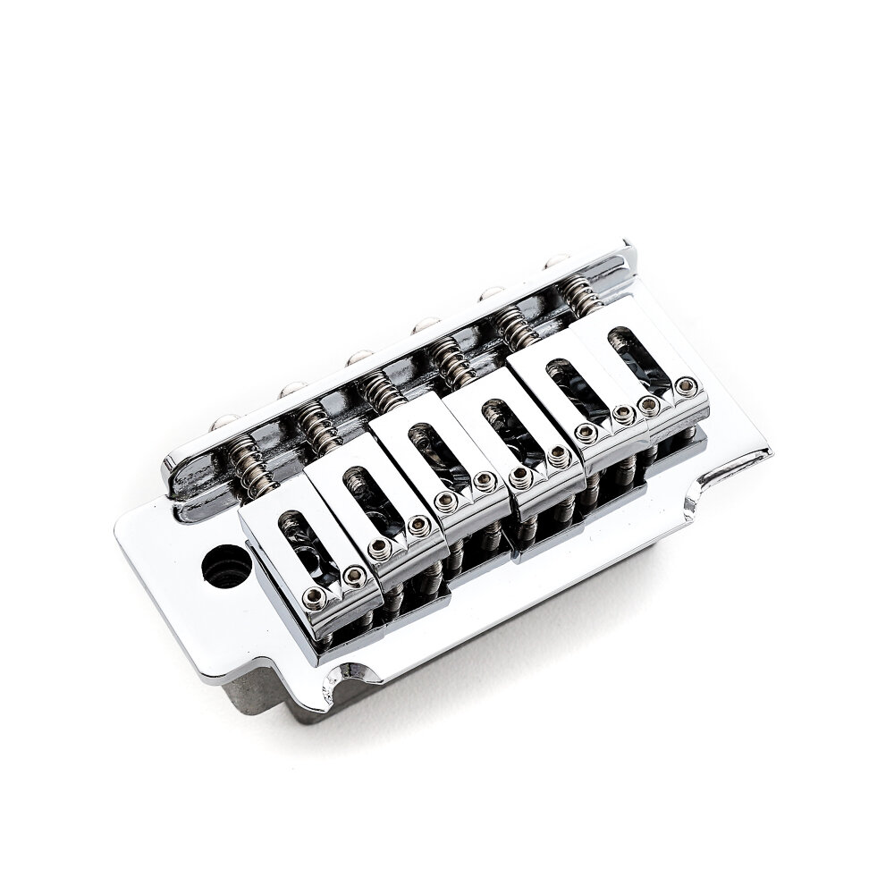 Ponte com Sistema Trêmolo completo para Guitarra com acabamento cromado, Spirit Guitar Parts - TM6-CR. - Alavanca de encaixe removível - Bloco em aço com fixação por 2 pivôs - Altura do bloco 36.0mm - Espaçamento das cordas 52.5mm - Inclui: alavanca, mola, presilhas e chave allen Instrumentos compatíveis:Guitarra