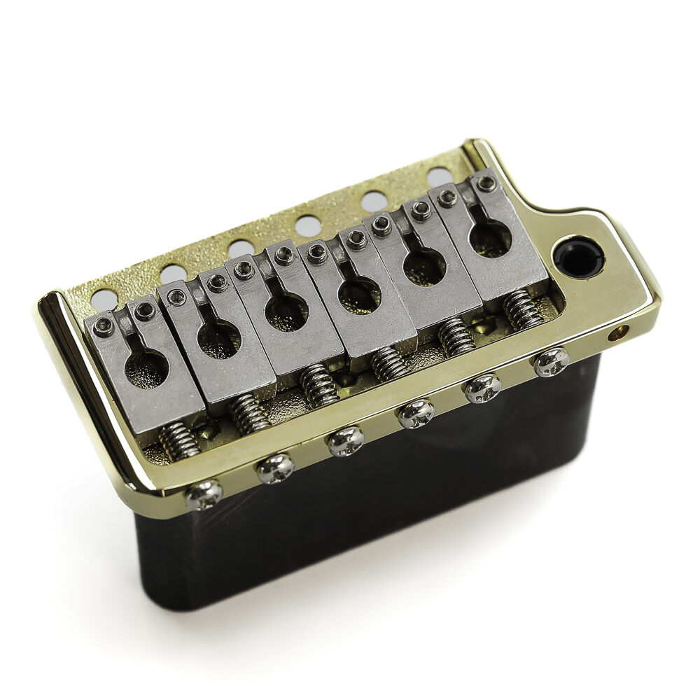 Ponte com Sistema Trêmolo completo em acabamento dourado, estilo PRS, modelo Spirit Guitar Parts - TP2-GD. - Modelo PRS - Bloco em aço de 40mm - lavanca angulável com encaixe removível e ação confortável - Espaçamento das cordas de 52,5mm
