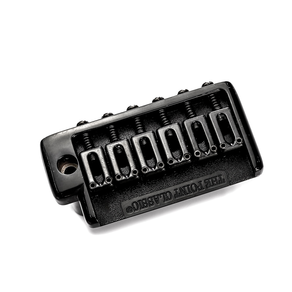 Ponte com Sistema Trêmolo para Guitarra com acabamento preto, Spirit Guitar Parts - CLSC-BK-POINT. Devido a popularização dos captadores piezo e circuitos eletrônicos, a CLSC-POINT é uma ponte clássica com sistema de trêmolo com adaptação para captador piezo. Com perfuração individual e fiação para seis captadores piezo, vendidos sem saddles, para que os saddles possam ser escolhidos de acordo com a preferência e o esquema eletrônica mais conveniente. - Alavanca removível e rosqueável - Distância total das cordas 53.0mm Instrumentos compatíveis:Guitarra