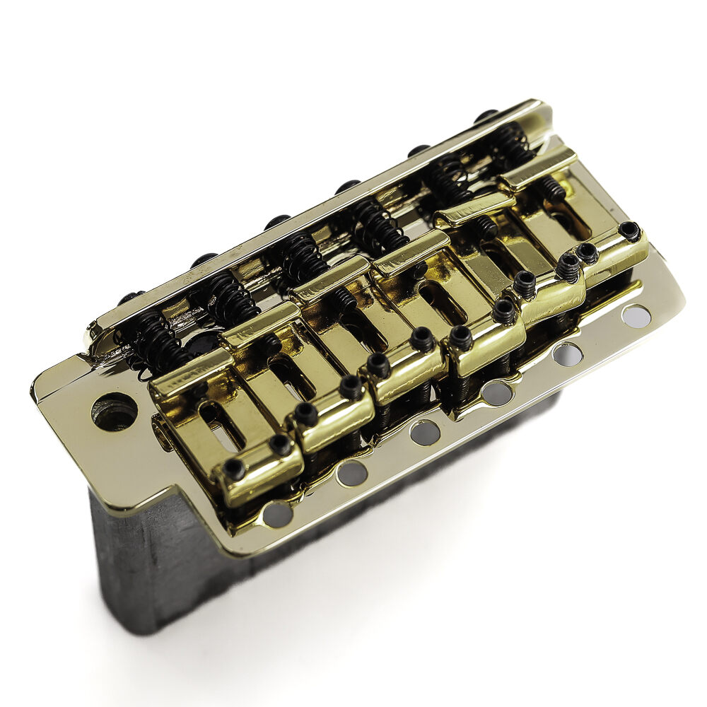 Ponte com Sistema Trêmolo completo para Guitarra com acabamento dourado e extremidade em plástico branco, modelo Stratocaster, Spirit Guitar Parts - ST40N-GD-WH. - Estilo Vintage modelo Stratocaster - Alavanca angulável e encaixe removível - Bloco em zinco fixado por 6 parafusos - Saddles em aço - Espaçamento das cordas 56.0mm - Inclui: alavanca, mola, parafusos, presilhas e chave allen