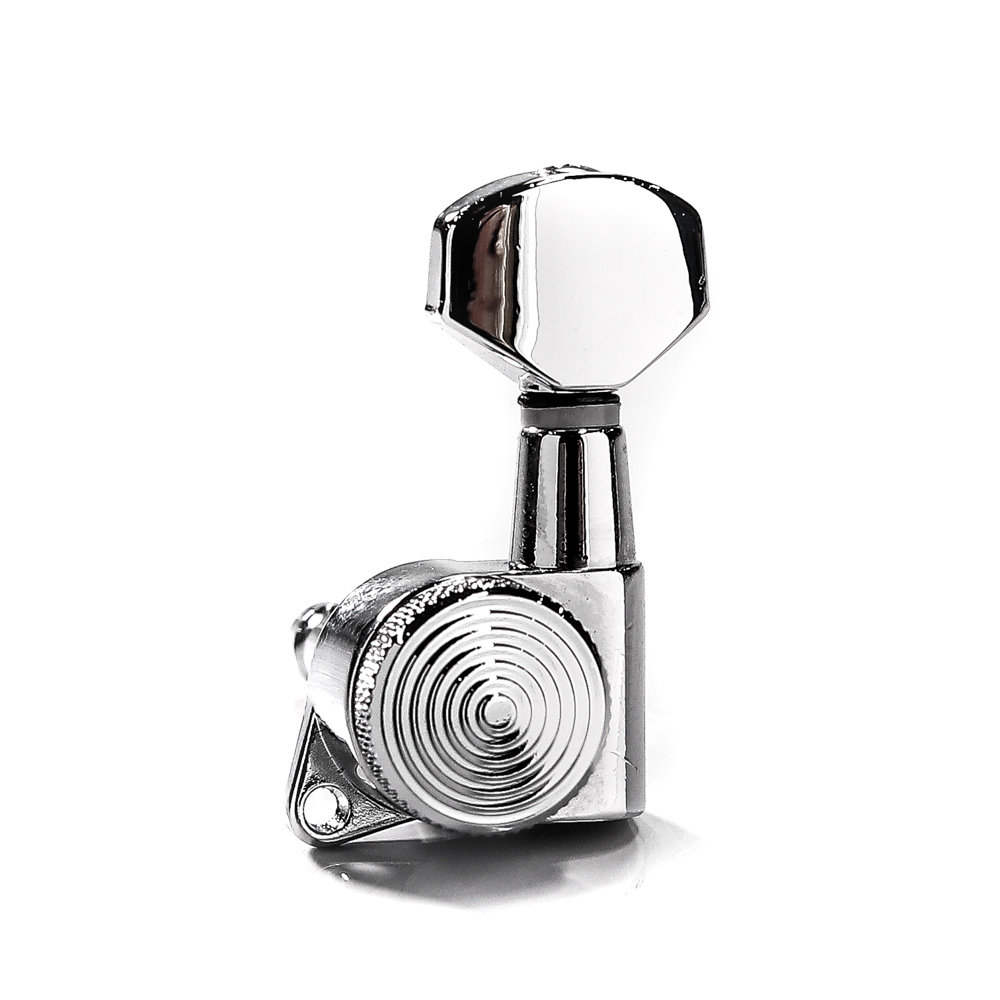 Tarraxas para Guitarra Blindadas com Trava em acabamento cromado, 6 tarraxas em linha para instrumentos canhotos e/ou headstocks invertidos, Spirit Guitar Parts J07LKJ-CR-L6. - Engrenagens com precisão de 19:1 Disposição das tarraxas:L6