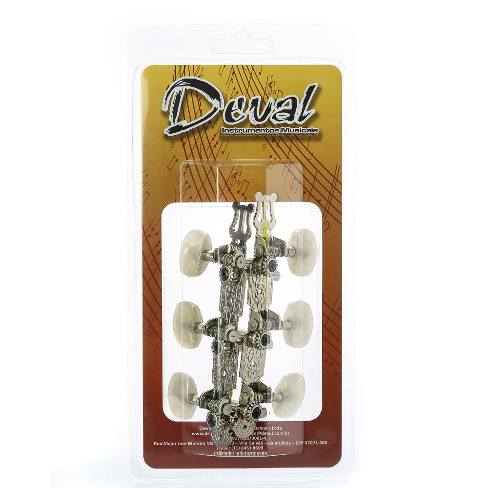 A Deval é conhecida no Brasil pela qualidade na fabricação de tarraxas. Jogo de 6 tarraxas standard de alta qualidade com pino fino, configuradas em 3+3, três de cada lado, acabamento dourado, botões em ABS e é voltado para instrumentos de cordas de aço. Garantindo um visual tradicional cromado e funcionamento macio. Cor:Cromada